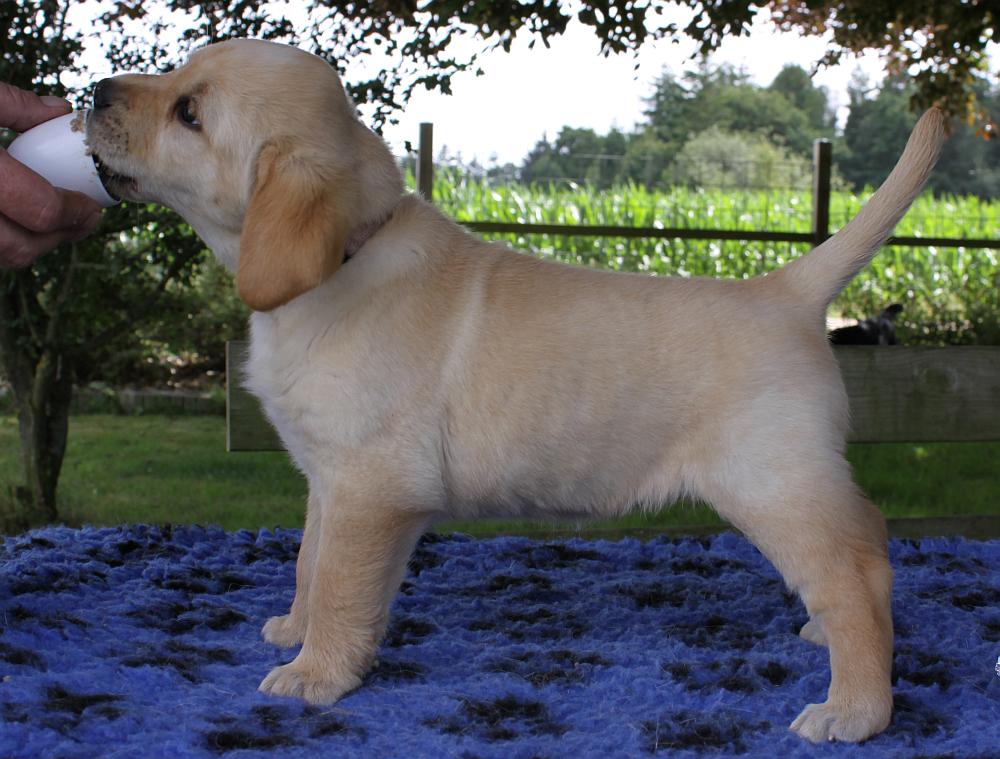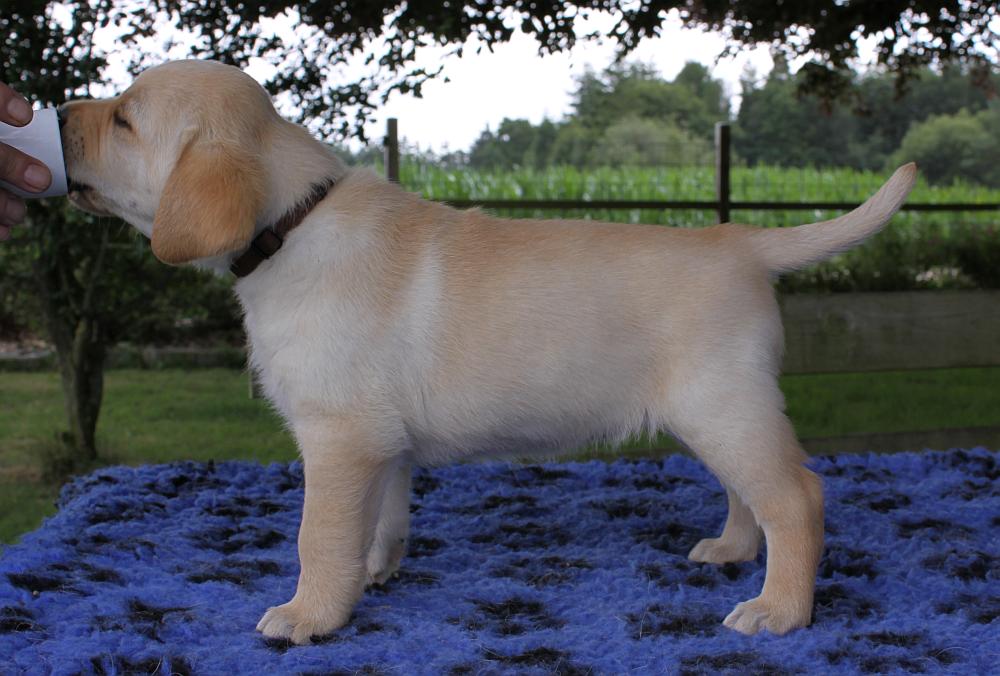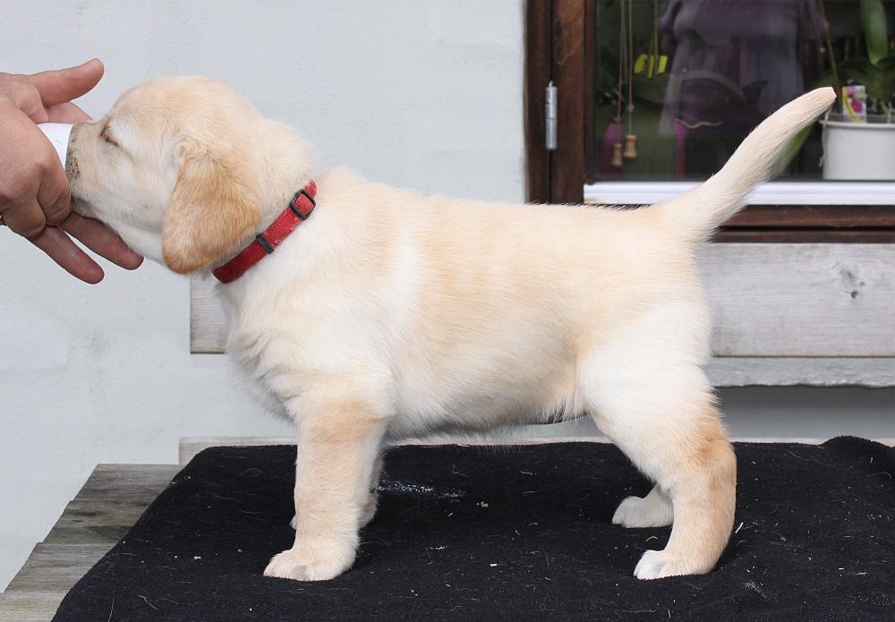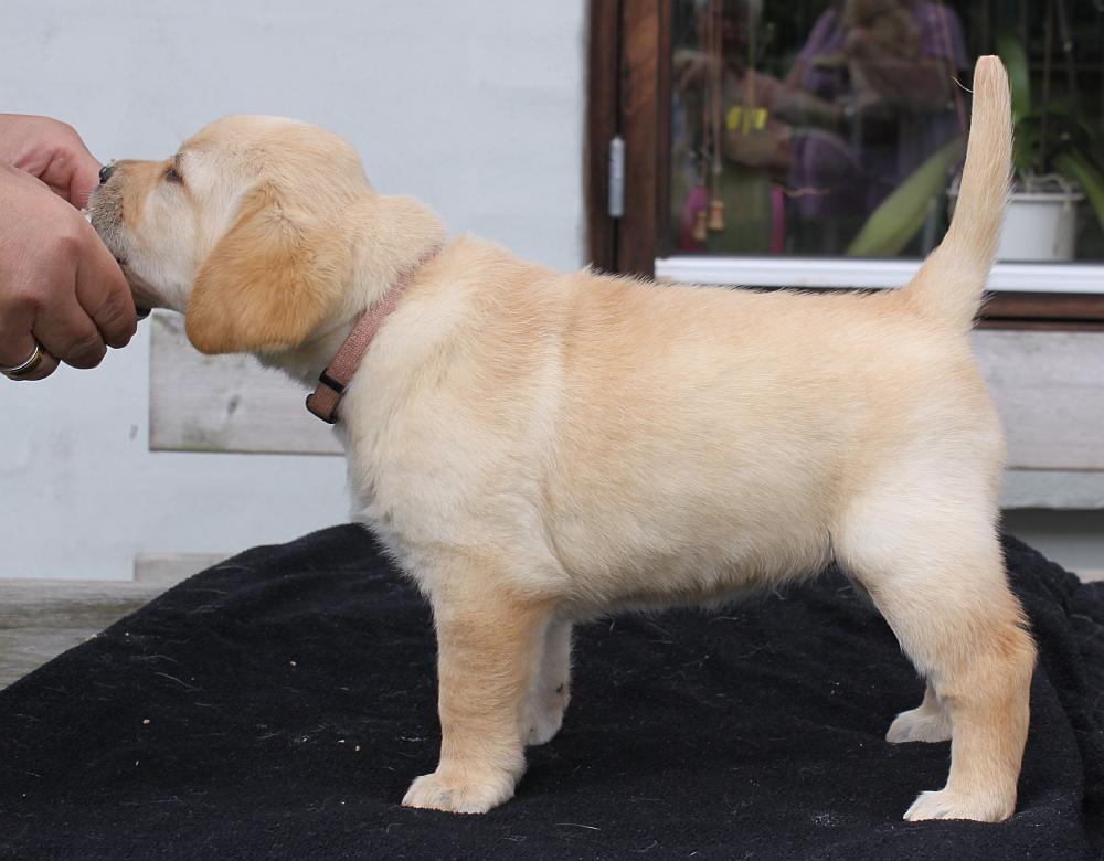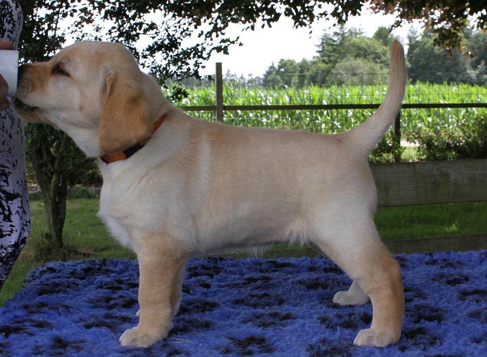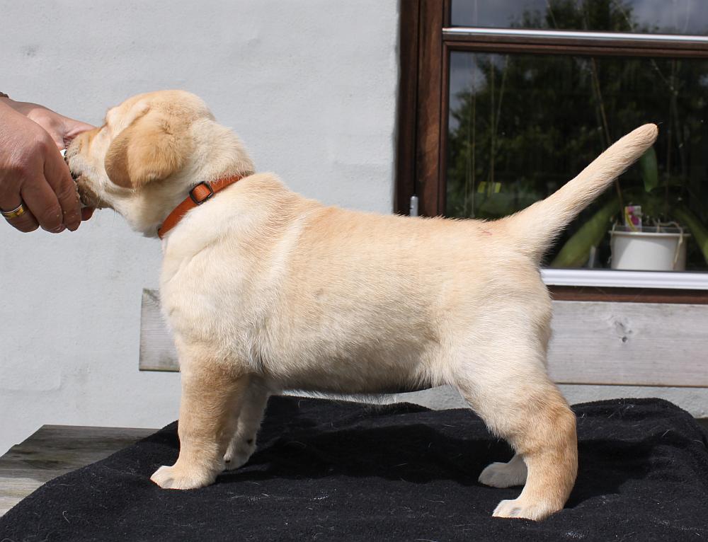 | Labrandrer Athene - flotte vinkler, fint forbryst, ikke så vild pels som andre af hvalpene, men smuk som et stjerneskud. Halen 'hænger lidt', men det er fordi leverpostej smager vildt godt. | |||