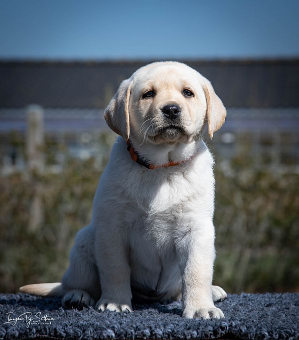 Labrander Guenevere har fået orange halsbånd, Labrander Gardenia her fået