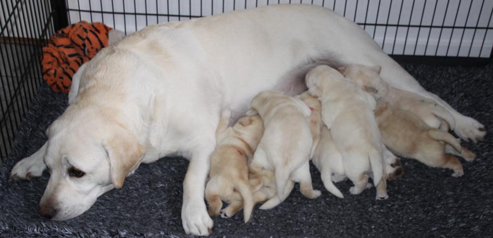 20.03: Klokken 02:45 1. hvalp en stor fin tæve på 600 gram. Og hun er naturligvis gul som sin mor og far. klokken 7.00 2. hvalp, sulten tæve på 460 gram. Sutter hos mor sammen med storesøster. Klokken 8.30 Der er lidt lang tid mellem hvalpene, men alt er fint og fredeligt. Veerne kommer, som de nu kommer. Klokken 11:15 3. hvalp en fin han på 460 gram. Klokken 12:30 4. hvalp, fin tæve på 525 gram. Alle 4 sutter ved mor. Klokken 14:40 5. hvalp, endnu en fin tæve på 470 gram. Klokken 13:40 6. hvalp, en han på 510 gram Klokken 15:00 7. hvalp, en han på 510 gram (nej vi gentager ikke bare os selv. Nu er de 7). Og 7 er det. 4 tæver, 3 hanner. Alle aktive, suser rundt, og spiser en masse ved mor Kali. En fantastisk tæve har gjort det en gang til. Tydelig, samarbejdende, rolig, stærk og ukuelig, også når de kom med halen og bagbenene først. Kali gik IKKE ned på energi og vilje til samarbejde! Og sammen med Jane, Arne og jeg klarede hun det så fint. Ingen døde eller sløje hvalpe. Deres navne skal starte med S, og sure, sultne og stærke passer på dem. En tur til dyrlæge efter 2. tæve/2. hvalp, viste os ved røntgen, at de lå så fint med hovedet forrest, bortset fra 3. hvalp. Han kom med bagbenene først, et kæmpearbejde for Kali, som fint lagde sig hos dyrlægen og gav mad til de 2. første efter røntgen. Han endte med at blive født hos dyrlægen, men han var nu nok kommet i bilen på vej hjem, hvis vi ikke havde givet Kali chancen for at give de 2 første mad inden hjemturen. Det går bare ikke altid som beskrevet i fagbøgerne. Det allervigtigste i enhver fødsel er samarbejdet. Samarbejdet med tæven men godt nok også med dyrlægen, som stoler lige så meget på os og vores tæver, som vi stoler på dyrlægen. Max. 2 timer mellem hver hvalp, står der. Men Kali har ikke læst den bog. Maya har ikke læst den. Sveske har slet ikke. Vera, Ivalo, Dina, Katla, Isis, Pona, Gaia og Nanna har heller ikke. Megan havde på ingen måde set en fødselsbog. Dike heller ikke skyggen af planlægning. Jeg har derimod læst, set videoer, taget kurser, og været med til mange mange fødsler. Arne også. Og det hjælper at samle al den viden, vi overhovedet har adgang til, og derefter bare tænke: May the force be with us! Tak kæreste Kali, vi glæder os til 8 uger mere med dig og de 7 små dværge. Nøj hvor er de bare lækre! Billeder følger, når vi er klar, har sovet og været til røntgen med P2 og Q2 i morgen. |