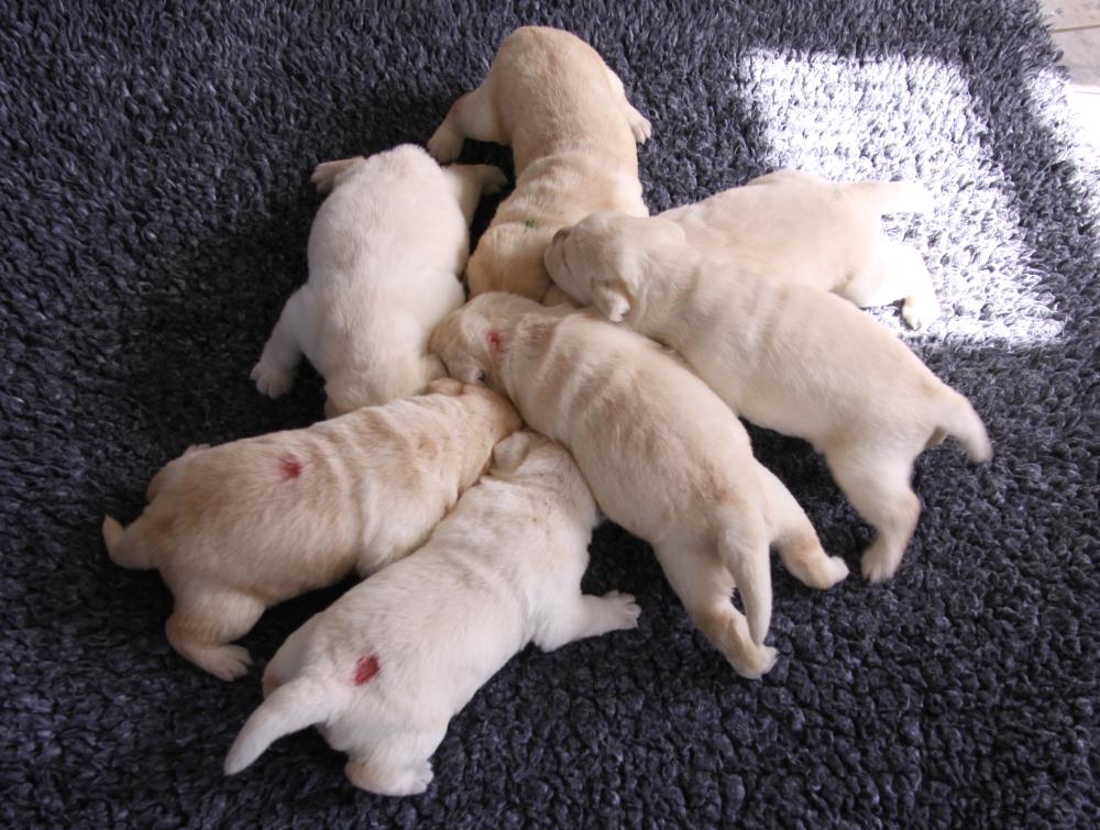 02.04: I dag har hvalpene fået deres stambogsnavne. Tæverne hedder: Labrander Sigyn, Lokes hustru Labrander Sini, Finsk pigenavn der betyder blå Labrander Spica, Den klareste stjerne i stjernetegnet jomfruen Labrander Sif, Thors hustru Labrander Sisyfos, Græsk sagnkonge Labrander Sige, en af Odins sønner Labrander Sirius, den klareste stjerne på himlen |