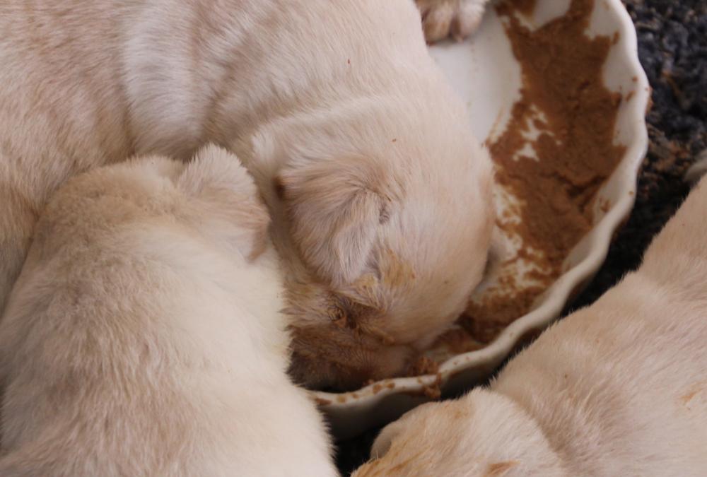 05.04: Så blev det dagen, hvor hvalpene skulle gøre første forsøg med andet end modermælk. Og dømme ud fra deres begejstring var det i sidste øjeblik, |