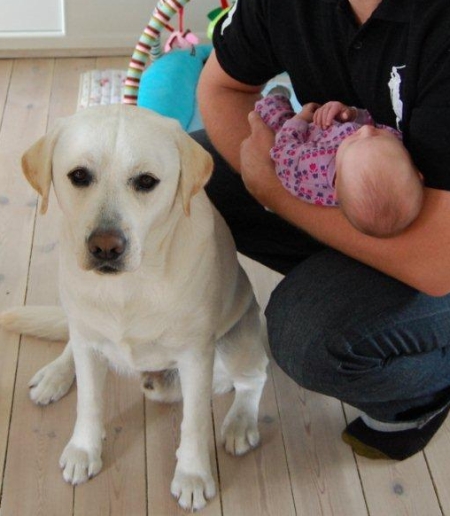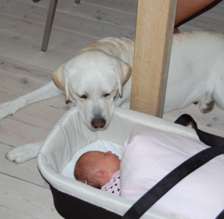| Labrander Gandalf, som nu hedder Turbo, er blevet 'storebror. Som I kan se af de billeder, vi har fået tilsendt, så er Turbo meget, meget glad for Lilli. Mette og Lars, som de stolte forældre hedder, fortæller, at selvom det er første baby, Turbo stifter bekendtskab med, så er det gået helt uproblematisk Turbo er passende forsigtig, trods sin unge alder, og selvom han kan finde på at slikke lidt på Lillis hænder, så har hun ikke spor imod det. Ren idyl! Stort TILLYKKE til hele familien med hinanden, og tak fordi I deler det med os! | |
