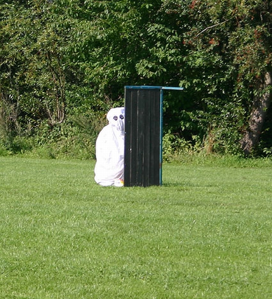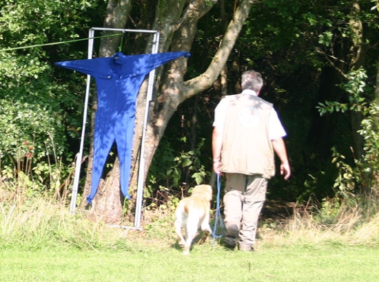 | Begge vores hunde klarede sig fantastisk flot, efter vores helt personlige "ønskeprofil". Mentalbeskrivelsen består af 8 momenter, hvor man presser hunden og forskrækker den med både visuelle (en kedeldragt bliver pludselig trukket op på et stativ få meter fra hunden, der føres i løs line forbi), auditive (en jernkæde trækkes hen over en metalplade), når hunden passerer, og et moment, hvor 2 spøgelser (se billedet herunder) nærmer sig fører og hund fra hver sin side. Nogle få meter fra hunden, vender de siden til og står stille. Snoren tages af hunden, som derefter frit kan undersøge spøgelserne eller stikke af og gemme sig i "flokken", som består af tilskuere. Både Mjølner og Cleo reagerede med forskrækkelse på kedeldragten og jernkæden, men de kom sig rimeligt hurtigt over forskrækkelsen, tog kontakt med hhv. kedeldragt og jernplade, og kunne herefter gå forbi i løs line uden at vise stressreaktioner eller frygt. Mjølner var som forventet meget ens i sit reaktionsmønster. Han tog de fleste ting, som han plejer, med selvtillid, ro og overblik, og han afreagerer lynhurtigt, når han har undersøgt tingene. Ved spøgelserne var han lidt overraskende "stærk", da han blev foran Arne, knurrede og gøede, hoppede på stive ben hen i mod spøgelserne, og så snart snoren blev taget af ham, løb han forbi det ene spøgelse, hen til det andet, blev rost og nusset af spøgelse 2, da det var demaskeret, og gik herefter hen og lagde sig i flokken, uden at tage notits af det 1. spøgelse, der blev demaskeret. | |