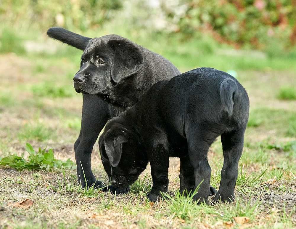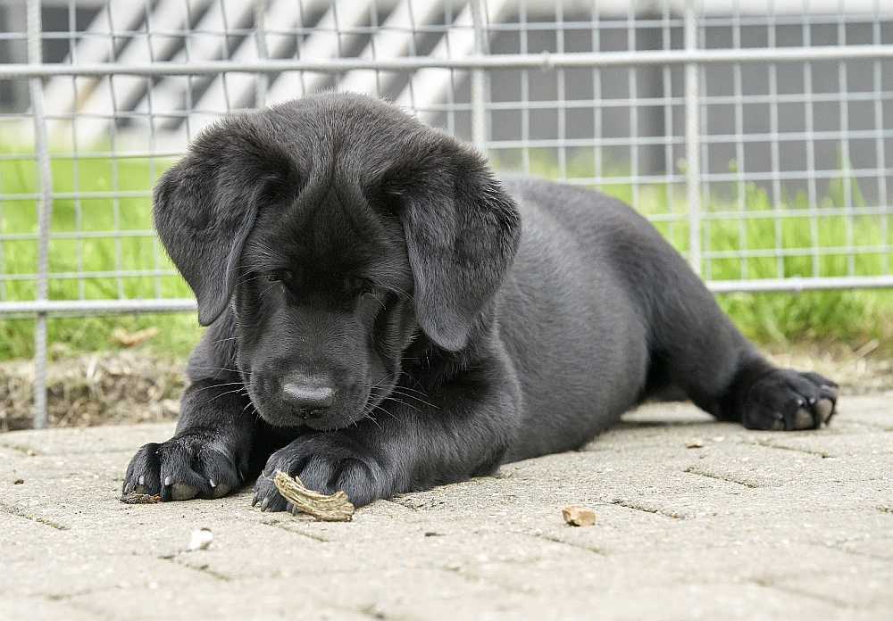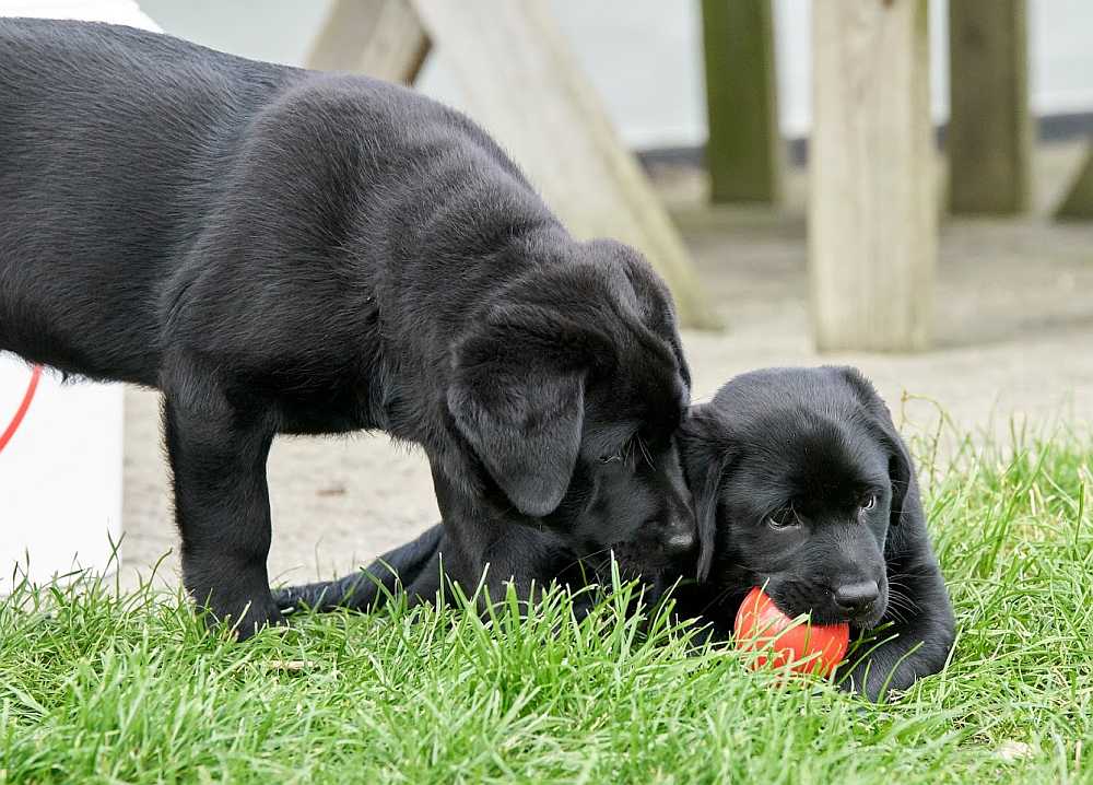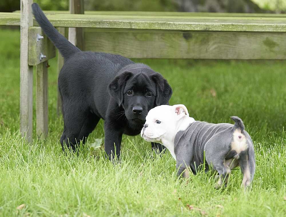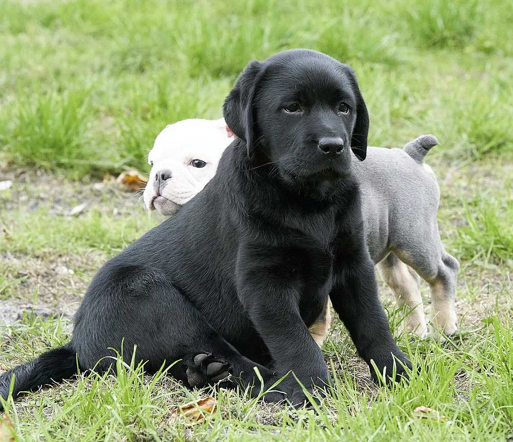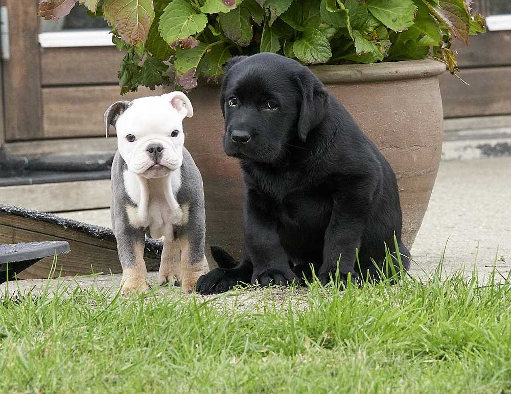 | Carla med sin lille ven Lilo. Det er altså ikke en helt ægte labrador, men det tror hun nu nok selv, hun er. Lilo er en old english bulldog, men mindre end de andre hvalpe i hendes kuld. |