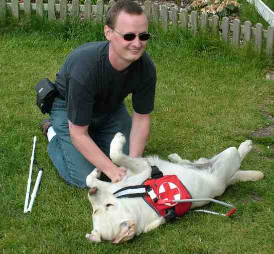 | 19.06: Idag, på E-kuldets 1½ års fødselsdag, har vi haft den fornøjelse at aflevere Wimsey (Labrander Eldorado) til Henrik. Henrik kontaktede os for ca. 1½ år siden med en forespørgsel om, hvorvidt vi kunne levere en velsocialiseret, begyndertrænet, sund unghund til ham, som han kunne tage med til sit nuværende hjem i Tyskland, og der få ham videretrænet til førerhund. Sammen med Paul Erik Høy tog vi udfordringen op, men at det i dag skulle være Paul Eriks hund, Wimsey, vi afleverede, blev nu først besluttet efter Paul Eriks død og røntgenundersøgelse i 1 års alderen, som viste at Wimsey er AA og 00. Vi er stolte over at kunne sige, at Henrik i dag mødte sin førerhunde-aspirant, og det var gensidig kærlighed ved første øjekast. Wimsey og Henrik skal lære meget endnu, og der er selvfølgelig ingen garanti for, at "projektet" (undskyld, Henrik, du ved, hvad jeg mener) vil lykkes. Om en måneds tid flytter Henrik og Wimsey hjem til Tyskland, hvor den egentlige træning så vil foregå med en privat træner, der kommer i deres hjem dagligt og træner Wimsey, og først når den professionelle træner har sagt god for Wimseys uddannelse, kan han for alvor kaldes "førerhund". Men den tillid Henrik i første omgang viste os og Paul Erik, og i dag viste Wimsey, da han uden tøven lod Wimsey føre rundt i huset og ud i haven, fortjener og har vores dybeste respekt. Paul Erik og Henrik kommunikerede fra starten via mail, om hvilke træningsmetoder og behov, den kommende førerhund havde, og Paul Erik var med os i haven i dag. I ånden ganske vist, men han var der! Vi ønsker Henrik og Wimsey al mulig held og lykke på deres videre færd, som vi får lov at følge tæt via mail, telefon og besøg hos dem, og både mor Nanna (Gilhøj´s Nuttede Nanna) og far Dario (Lab Treasure´s Dario) kan roligt tage sig en whisky og en cigar og være stolte af deres søn; det er vi! Med Henriks tilladelse bringer vi et par billeder fra i dag. | |
